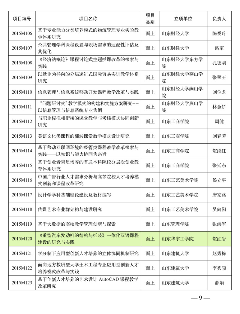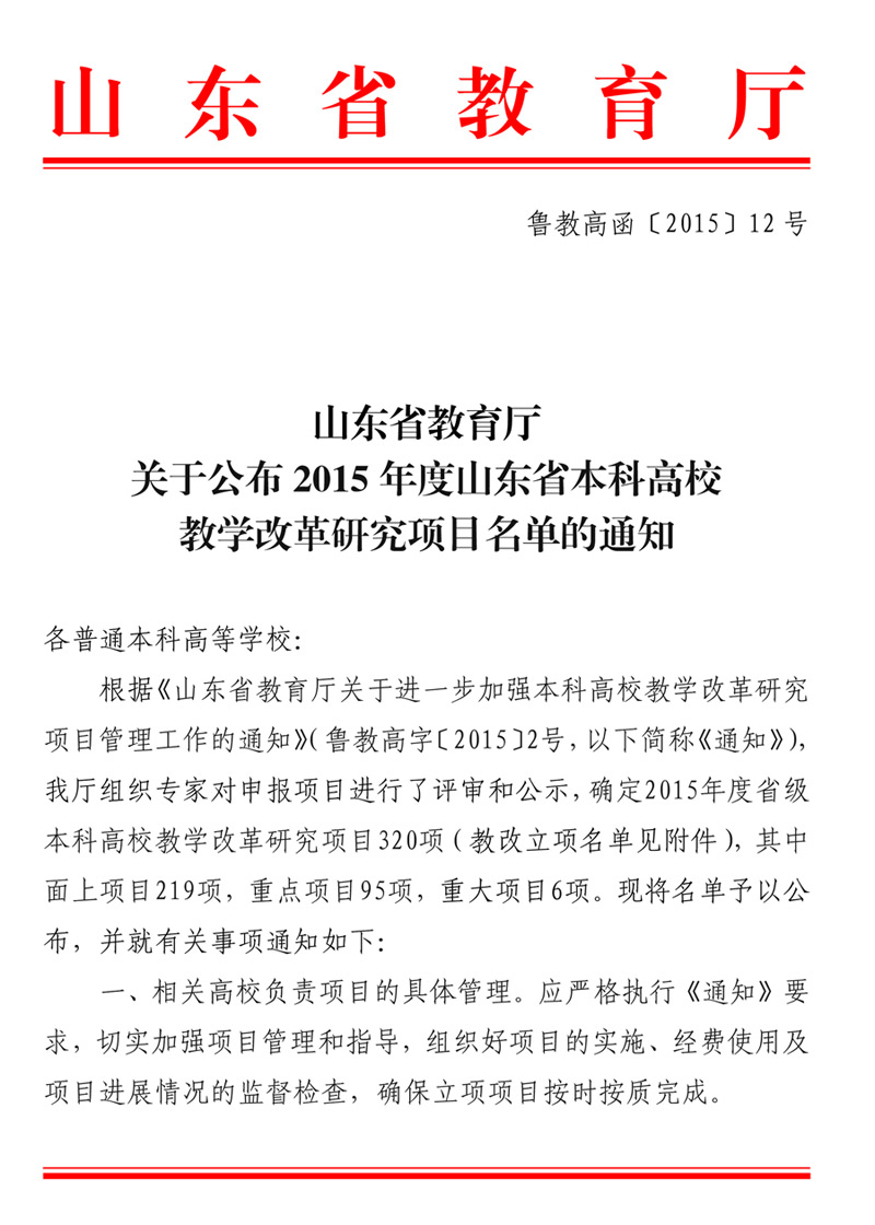 11月27日,山东省教育厅公布了2015年度山东省本科高校教学改革研究项目名单(鲁教高函[2015]12号),BetWay必威贺红岩老师主持的课题《〈重型汽车发动机的结构与拆装〉一体化双语课程建设的研究与实践》(项目编号2015M120)顺利通过审核,获准立项。本次共有320项教学改革研究项目获准立项,其中面上项目219项,重点项目95项,重大项目6项。